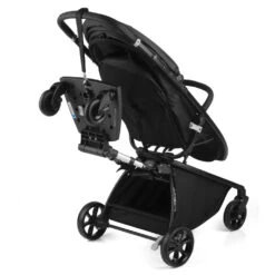 Fixation au châssis de la poussette au moyen d’adaptateurs que l’on peut laisser fixés à la poussette.