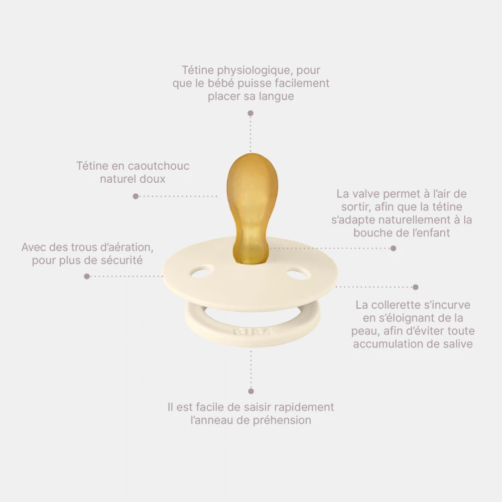 Optez pour le Pack de 2 sucettes colour caoutchouc symétrique 6 mois+ woodchuck et blush de chez Bibs. Utilisable dès 6 mois, elles seront idéales pour rassurer et réconforter bébé. La tétine symétrique en caoutchouc a un embout en forme de goutte légèrement aplatie. La partie plate empêchera bébé d’enrouler sa langue autour de la tétine pour rester à plat et qu’il puisse facilement l’écraser contre son palais. L’embout physiologique fait que votre enfant n’aura pas besoin de téter aussi fort qu’avec une tétine ronde pour qu’elle s’aplatisse complètement sa bouche. La valve permettra à l’air de sortir pour que la tétine s’adapte naturellement à la bouche de bébé. La collerette s’incurve en s’éloignant de la beau de bébé pour éviter l’accumulation de salive. Pratique, ces sucettes Bibs sont compatibles avec les attaches sucettes Bibs.