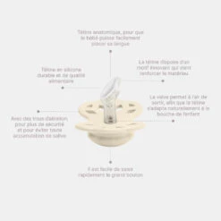 Optez pour le Pack de 2 sucettes infinity silicone anatomique 0-6 mois ivory et blush de chez Bibs. Utilisable dès la naissance, elles seront idéales pour rassurer et réconforter bébé. La tétine anatomique en silicone a un embout courbé. Cela incitera bébé à placer sa langue et à téter de la même façon qu’il le ferait au sein. L’embout courbé fait que votre enfant n’aura pas besoin de téter aussi fort qu’avec une tétine ronde pour qu’elle s’aplatisse complètement sa bouche. La valve permettra à l’air de sortir pour que la tétine s’adapte naturellement à la bouche de bébé. La collerette est munie de cercle entrelacés qui représentent le cycle de la vie, l’infini et l’éternité. Pratique, ces sucettes Bibs sont compatibles avec les attaches sucettes Bibs.