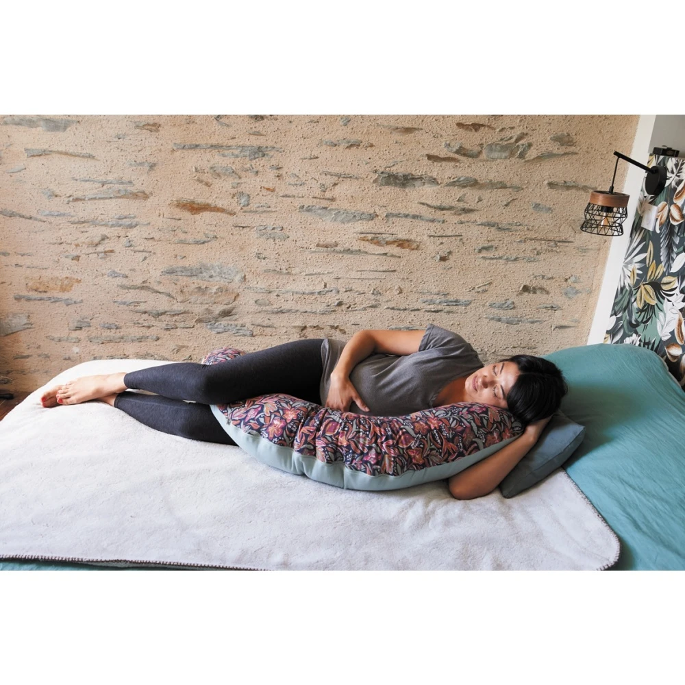 Le Coussin de maternité floral/vert de gris de chez Candide. Ce coussin d’allaitement permet durant la grossesse de soulager le dos, le ventre et les jambes de la future maman. Il deviendra une aide durant l’allaitement ou le biberon en soulageant le dos du parent. Le coussin d’allaitement est déhoussable et lavable. Le garnissage en billes permet de s’adapter à toutes les morphologies.