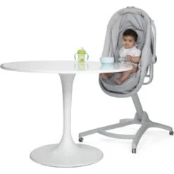 Dans la configuration chaise haute, utilisable de 6 à 36 mois (15kg max), bébé est installé en hauteur et peut ainsi observer ses parents durant les différents moments de la journée. Il peut aussi prendre son repas à table à côté de ses parents en rapprochant le Baby Hug 4 in 1 de la table en ajustant la hauteur.