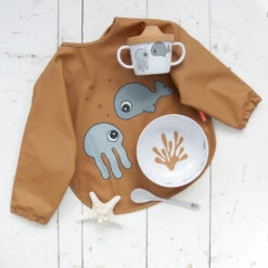 Le Bavoir à manches 6-18m sea friends moutarde / gris est imperméable avec des manches élastiques pratiques et une fermeture velcro. Il est facile à nettoyer.