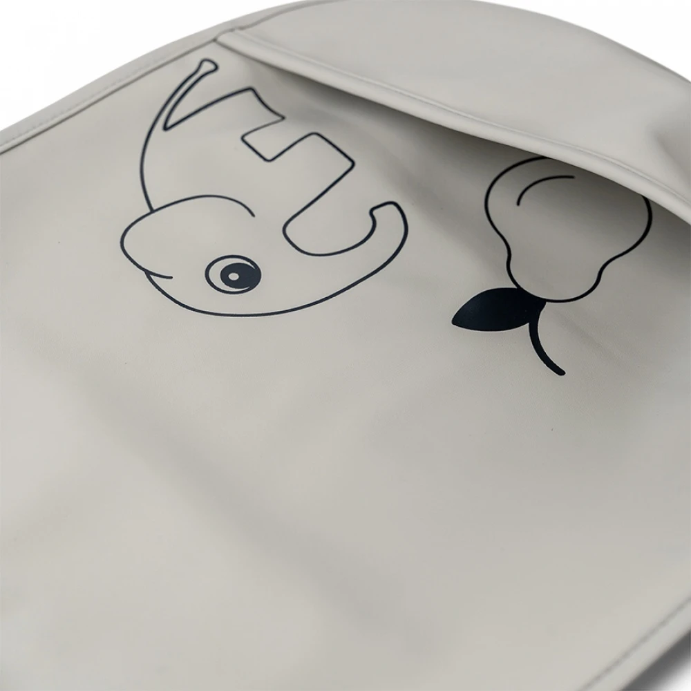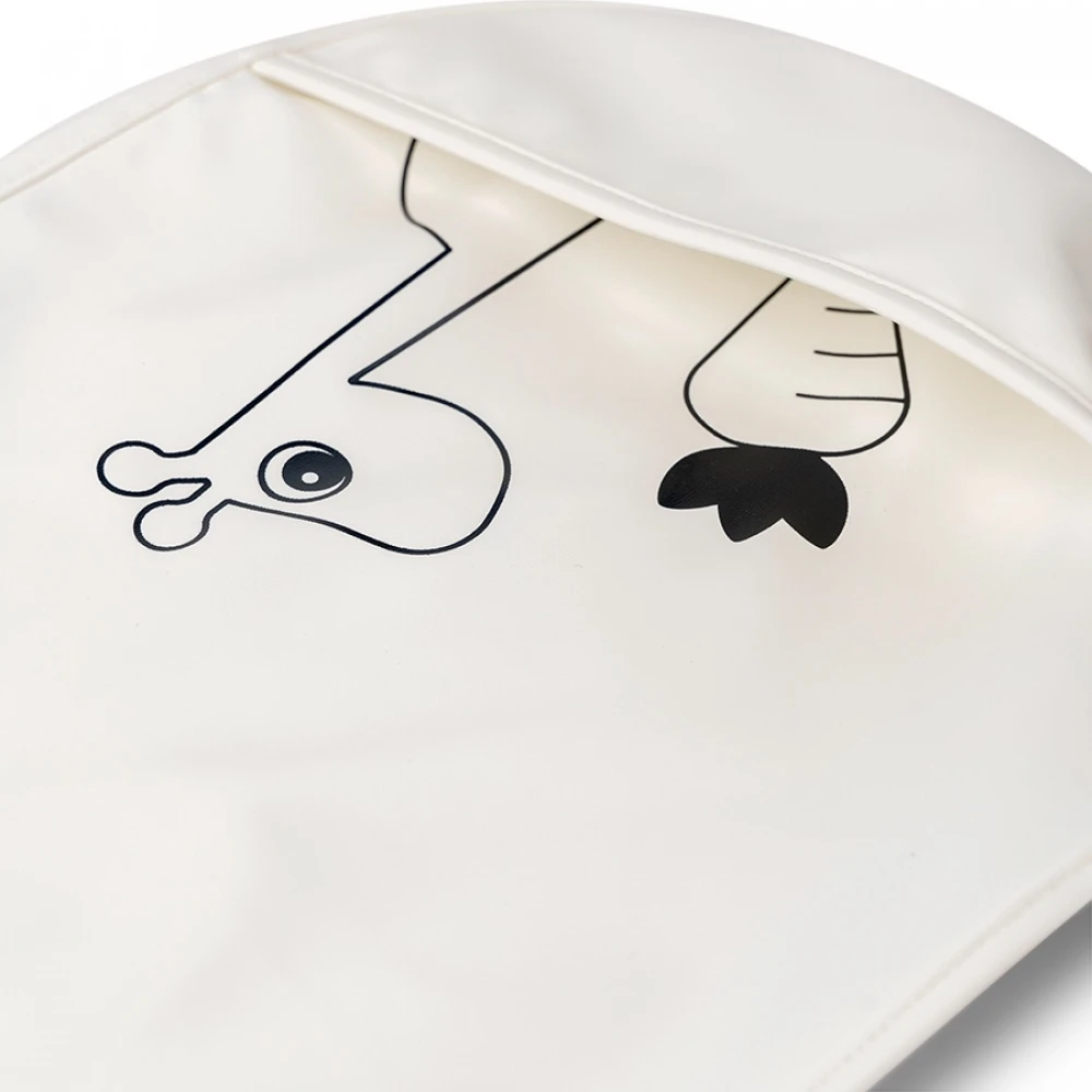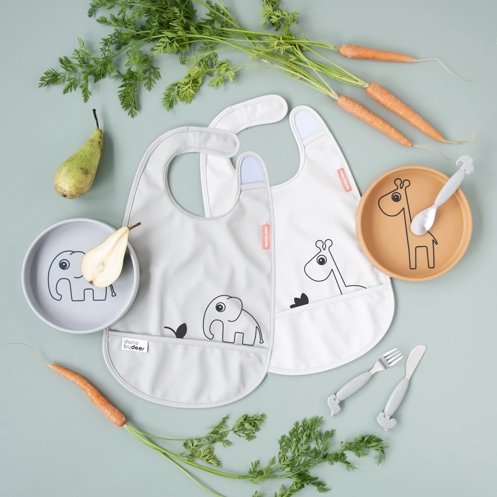 L’ensemble de bavoirs pratique est de deux tons de bleu et Antee le fourmilier et Nozo le rhinocéros sont prêts à garder votre tout-petit au sec et propre tout en rendant le repas très amusant. Caché dans la poche, vous trouvez une pomme et une carotte