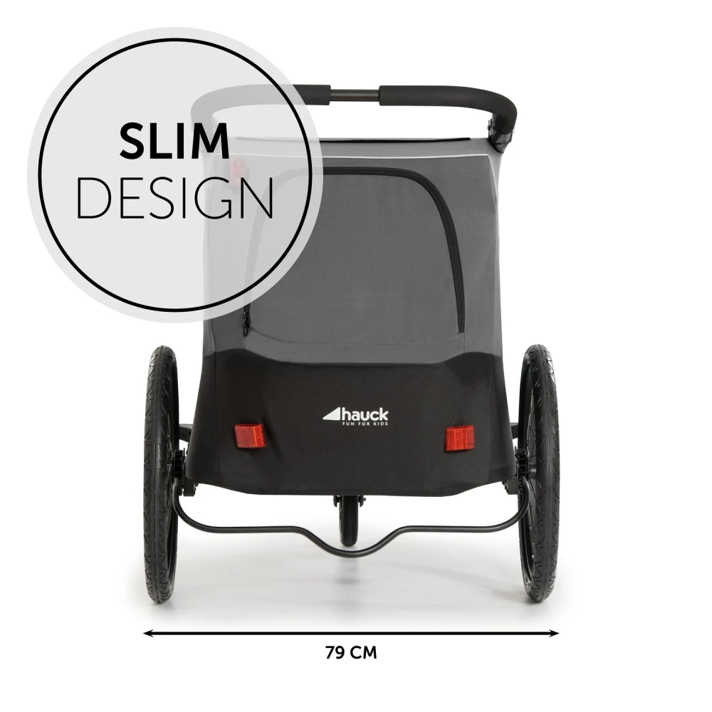 Le chariot Dryk Duo Grey de la marque Hauck. Utilisable pour les enfants de 6 mois à 4 ans. C’est la remorque idéale pour les promenades avec 1 ou 2 enfants. Vous pourrez le fixe à votre vélo pour vous déplacer en famille ou encore transformer le chariot en poussette. Le chariot Dryk Duo est la poussette multifonctionnelle à avoir ! Sur la route, vous ne sentirez pas les tremblements grâce au siège rembourré qui apporte un maximum de confort sans compter l’habitacle à température contrôlée…mais aussi la moustiquaire lors de vos balades en été le long de la mer ou le long d’un lac ! Arrivée à destination, pourquoi ne pas se faire un petit pique-nique que vous aviez préparé et soigneusement rangé dans le coffre de contenance 6 kg maximum. Puis ne vous inquiétez pas, le chariot possède un feu arrière afin d’être visible. Un conseil, vous pourrez nettoyer me chariot avec de l’eau uniquement et quelques produits d’entretiens ménagers. Surtout n’utilisez pas de produit corrosif.