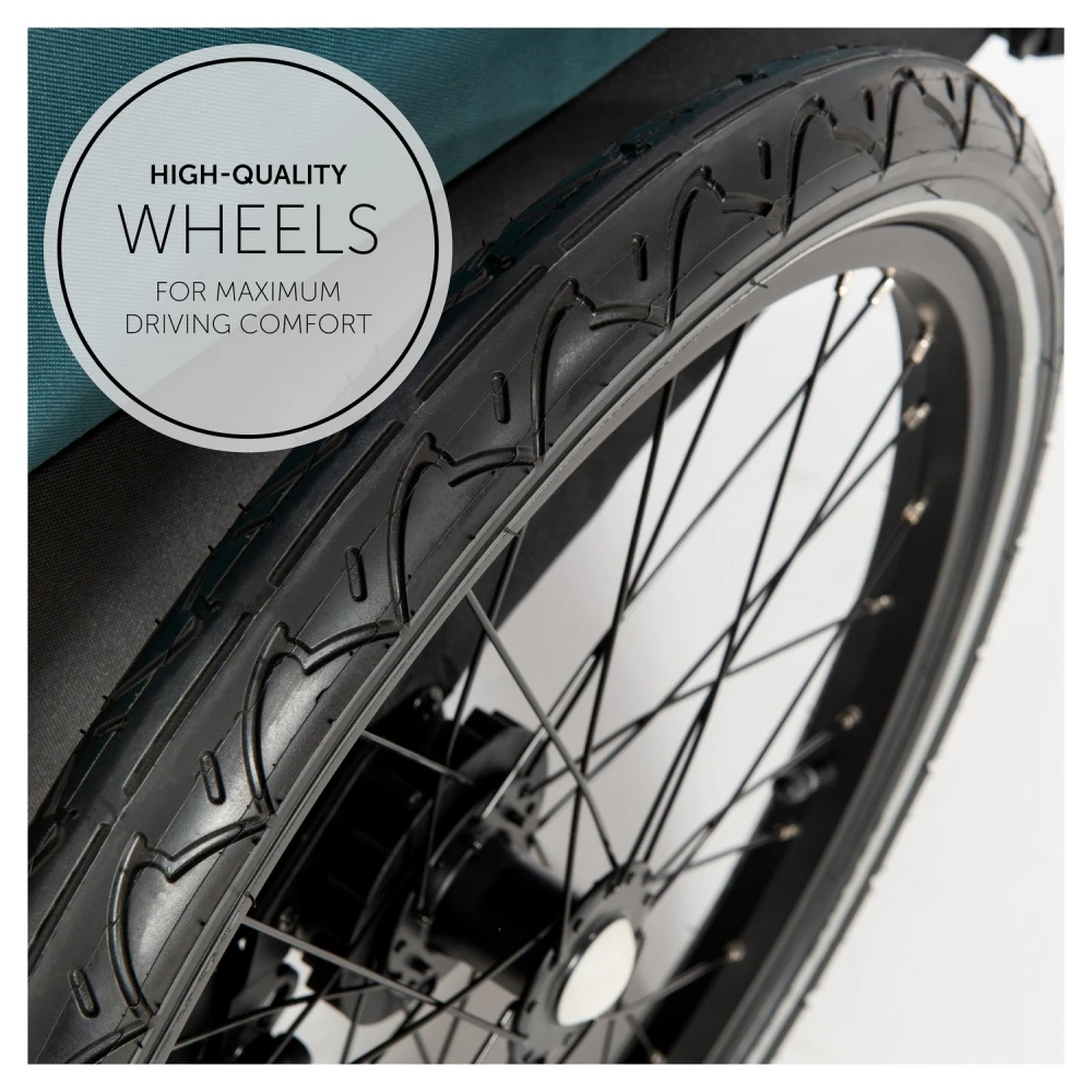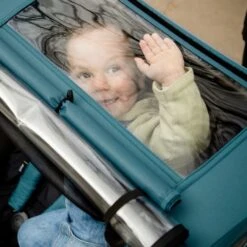 Le chariot Dryk Duo Petrol de la marque Hauck. Utilisable pour les enfants de 6 mois à 4 ans. C’est la remorque idéale pour les promenades avec 1 ou 2 enfants. Vous pourrez le fixe à votre vélo pour vous déplacer en famille ou encore transformer le chariot en poussette. Le chariot Dryk Duo est la poussette multifonctionnelle à avoir ! Sur la route, vous ne sentirez pas les tremblements grâce au siège rembourré qui apporte un maximum de confort sans compter l’habitacle à température contrôlée…mais aussi la moustiquaire lors de vos balades en été le long de la mer ou le long d’un lac ! Arrivée à destination, pourquoi ne pas se faire un petit pique-nique que vous aviez préparé et soigneusement rangé dans le coffre de contenance 6 kg maximum. Puis ne vous inquiétez pas, le chariot possède un feu arrière afin d’être visible. Un conseil, vous pourrez nettoyer me chariot avec de l’eau uniquement et quelques produits d’entretiens ménagers. Surtout n’utilisez pas de produit corrosif.