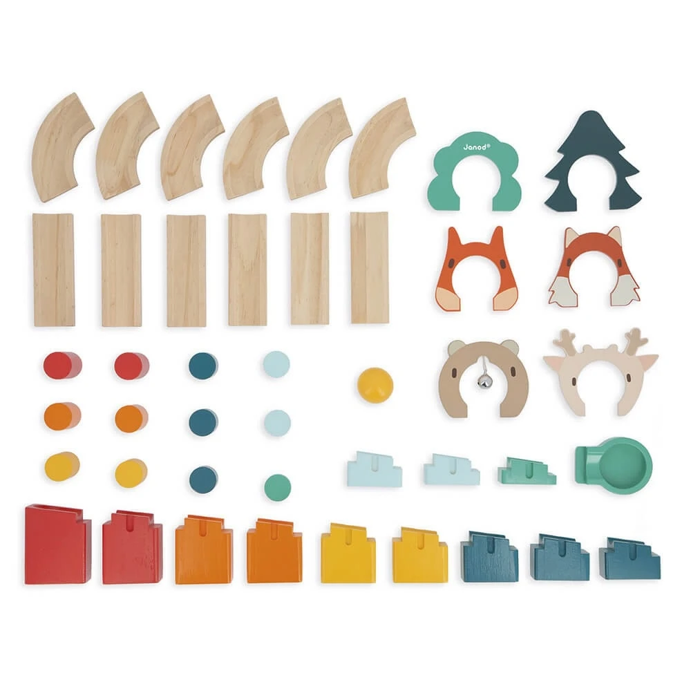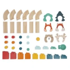 Optez pour Mon premier circuit en bois de chez Janod. Utilisable dès 2 ans. Ce circuit en boit fait plus d’un mètre de long ! Bébé aura de nombreuses combinaisons possibles grâce au 44 éléments dont 13 connecteurs, 12 piliers, 12 rails, 6 portes et 1 balle.