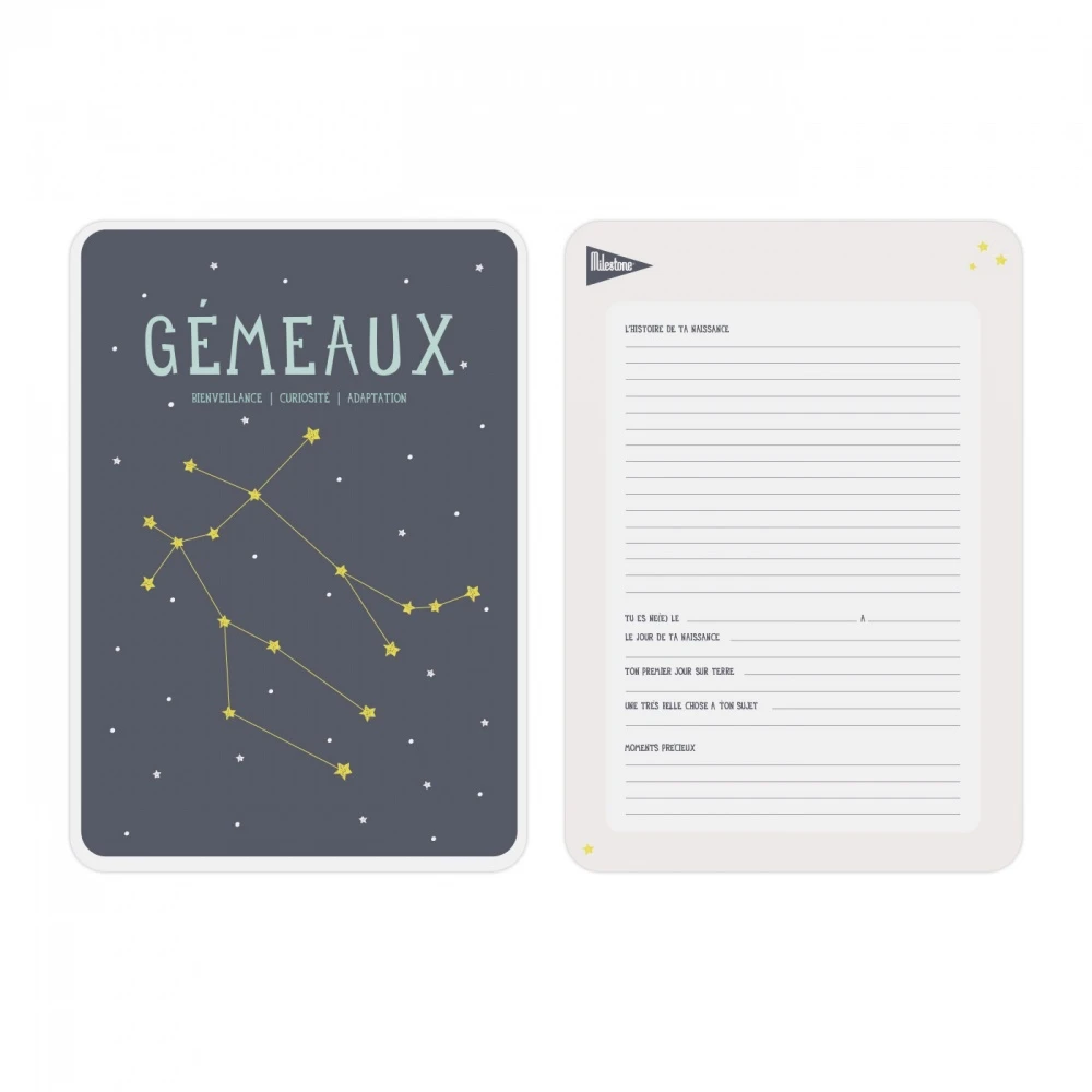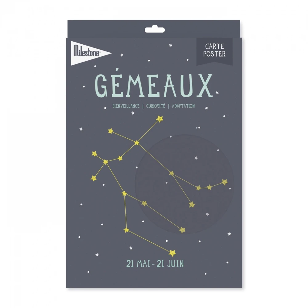 Affiche poster astrologique gémeau de la marque Milestone. C’est l’accessoire parfait pour personnaliser et décorer la chambre de votre bébé. Au dos de l’affiche, vous pourrez écrire au feutre pour garder des souvenirs des premiers mois de votre enfant. L’affiche est livrée avec un crochet pour l’accrocher au mur. Sur l’affiche, il y a la constellation du signe astrologique ainsi que 3 mots pour décrire les valeurs du signe.