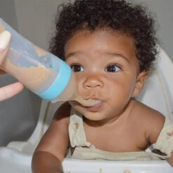 Le petit biberon Nuby est accompagné de 2 cuillères, une avec un débit lent pour une alimentation liquide et les bouillis très peu solides et l’autre pour les préparations semi-solides telles que le riz au lait. Afin de garder vos sacs propres et de garantir une hygiène optimale, un capuchon hygiénique de transport est fourni. Sa matière en silicone permettra de maintenir les aliments plus longtemps au chaud.
