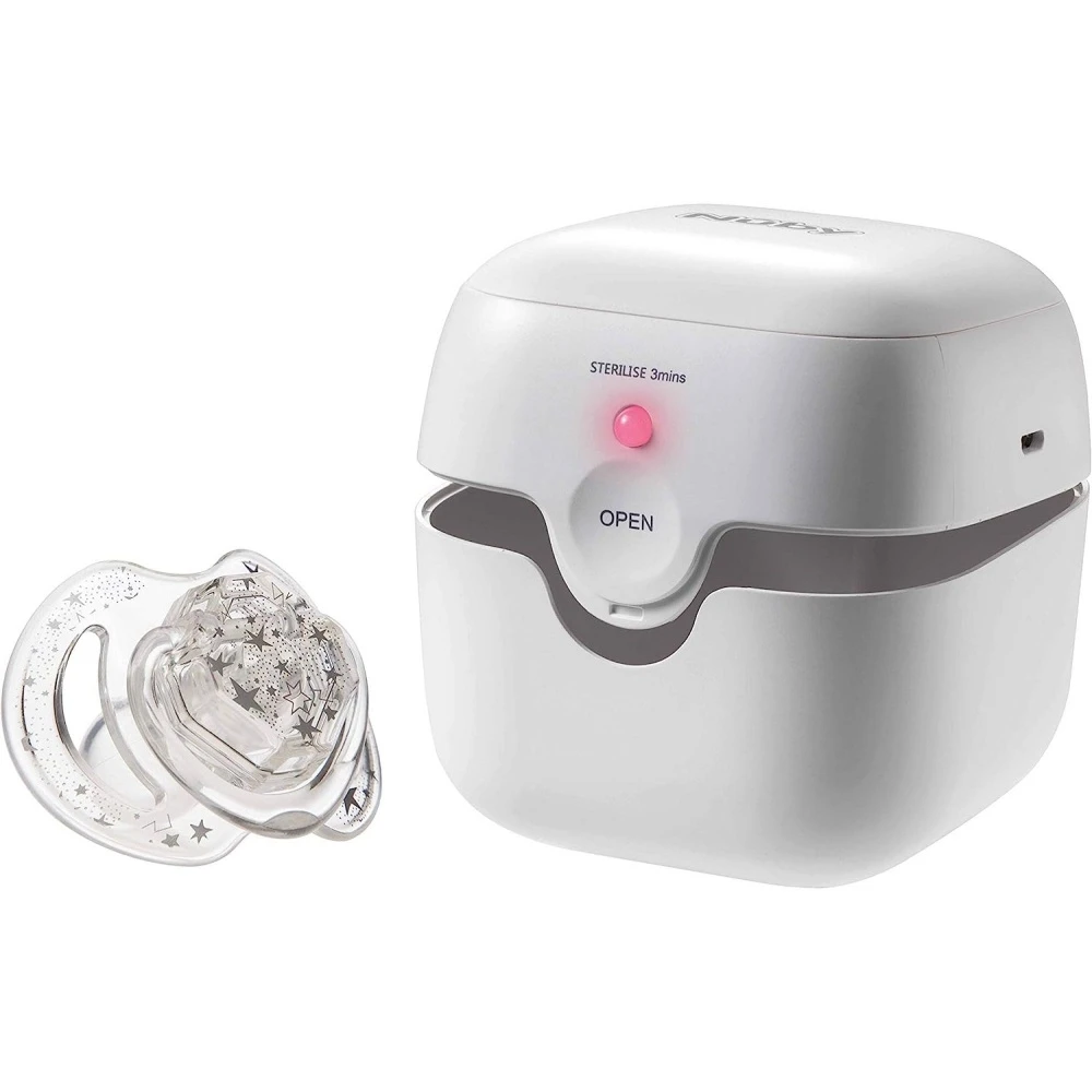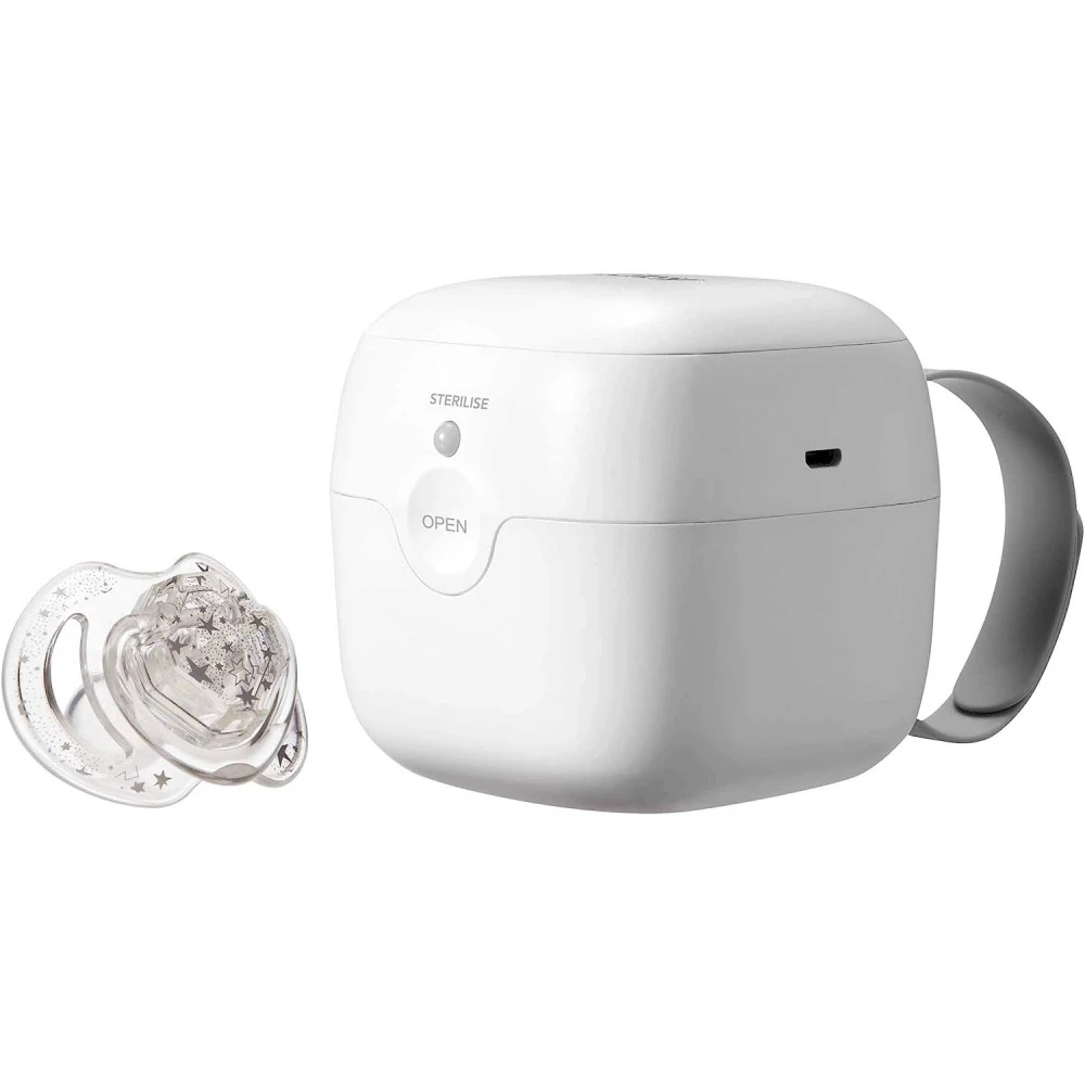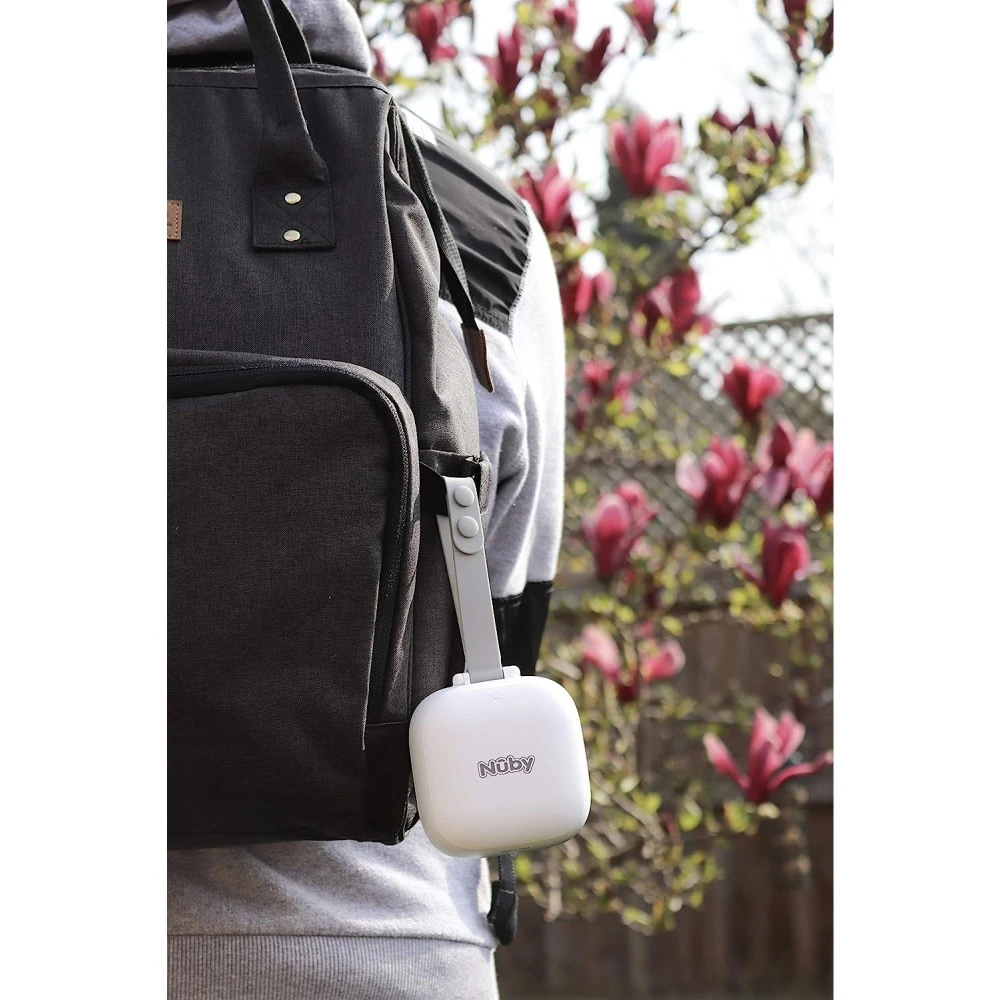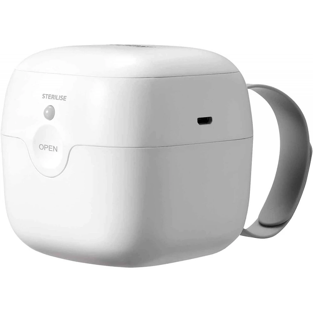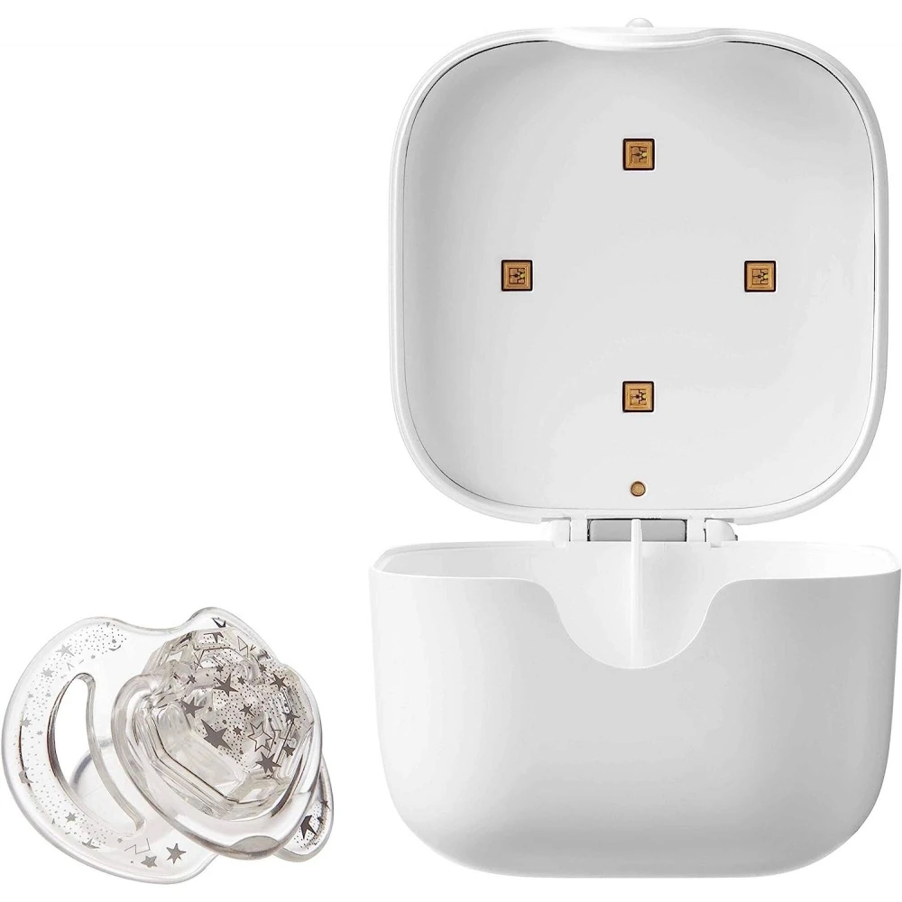 Optez pour ce stérilisateur nomade qui prendra seulement 3 minutes de votre temps. Le stérilisateur UV est conçu pour utiliser la lumière ultra-violette, également utilisée dans l’industrie médicale pour stériliser les pièces, équipement et matériels médicaux. Comment fonctionne la stérilisation par UV ? La lumière ultra-violette est en fait un rayonnement électromagnétique qui tue les micro-organismes. Le résultat est l’élimination de 99,99% des bactéries. Avec le stérilisateur UV portable de Nûby, pas besoin d’eau ou de micro-ondes. Ouvrez simplement la boite, et déposez une sucette. Appuyez sur le bouton Stériliser pour entamer le cycle UV de 3 minutes. La lumière clignote pendant le processus de stérilisation, et l’appareil s’arrête automatiquement s’il est ouvert pendant ce cycle. Après la stérilisation, la sucette peut être utilisée immédiatement, pas besoin d’attendre qu’elle refroidisse puisqu’aucune chaleur n’a été utilisée. Le stérilisateur peut se brancher sur secteur via un câble USB, ou s’utiliser avec 3 piles AA – non fournies.