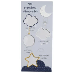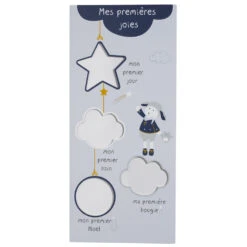 Grand pêle-mêle à 12 vues assorti au thème Merlin. Produit original à offrir en cadeau de naissance, il permettra aux parents de garder un souvenir des petits et grands moments de la première année de leur enfant.