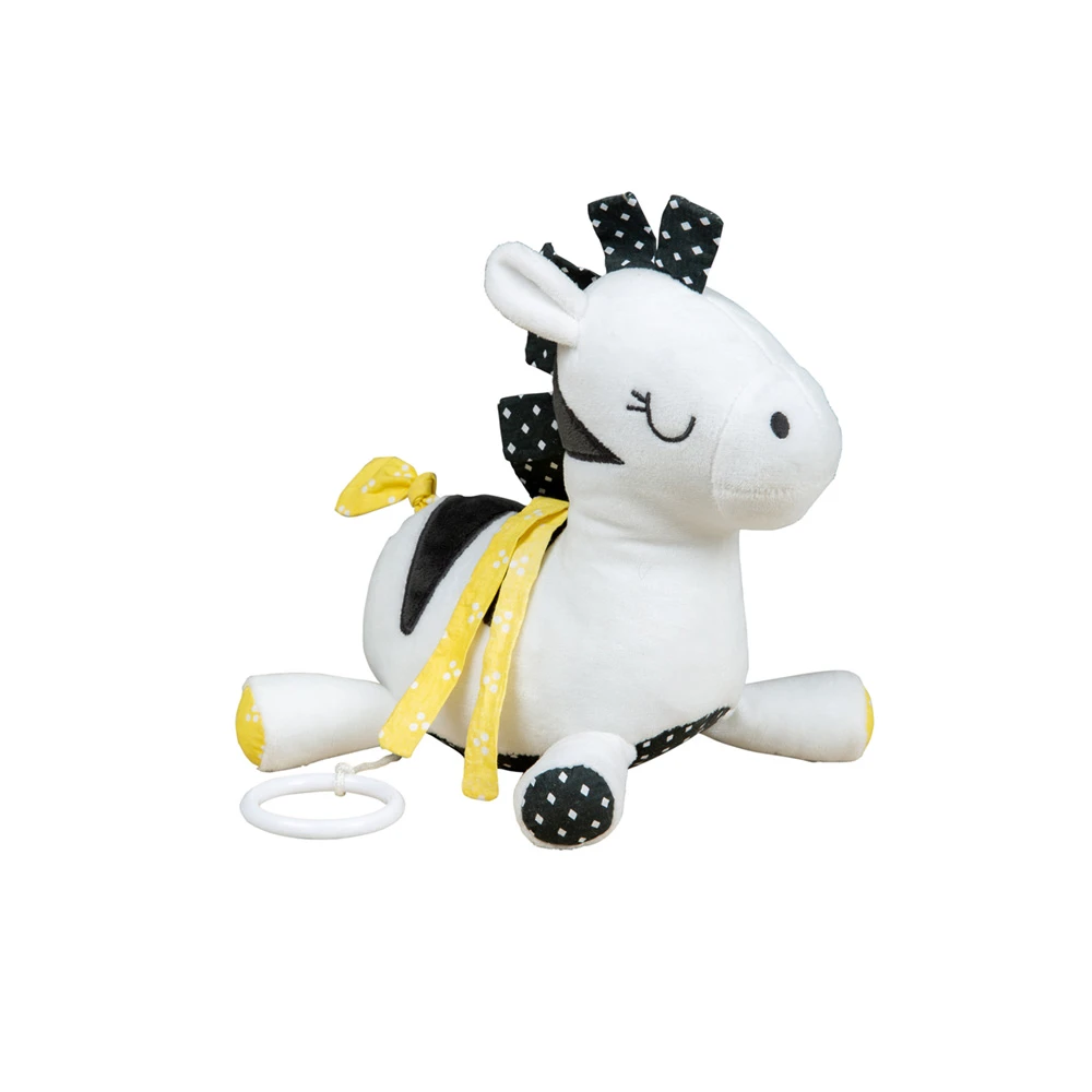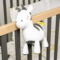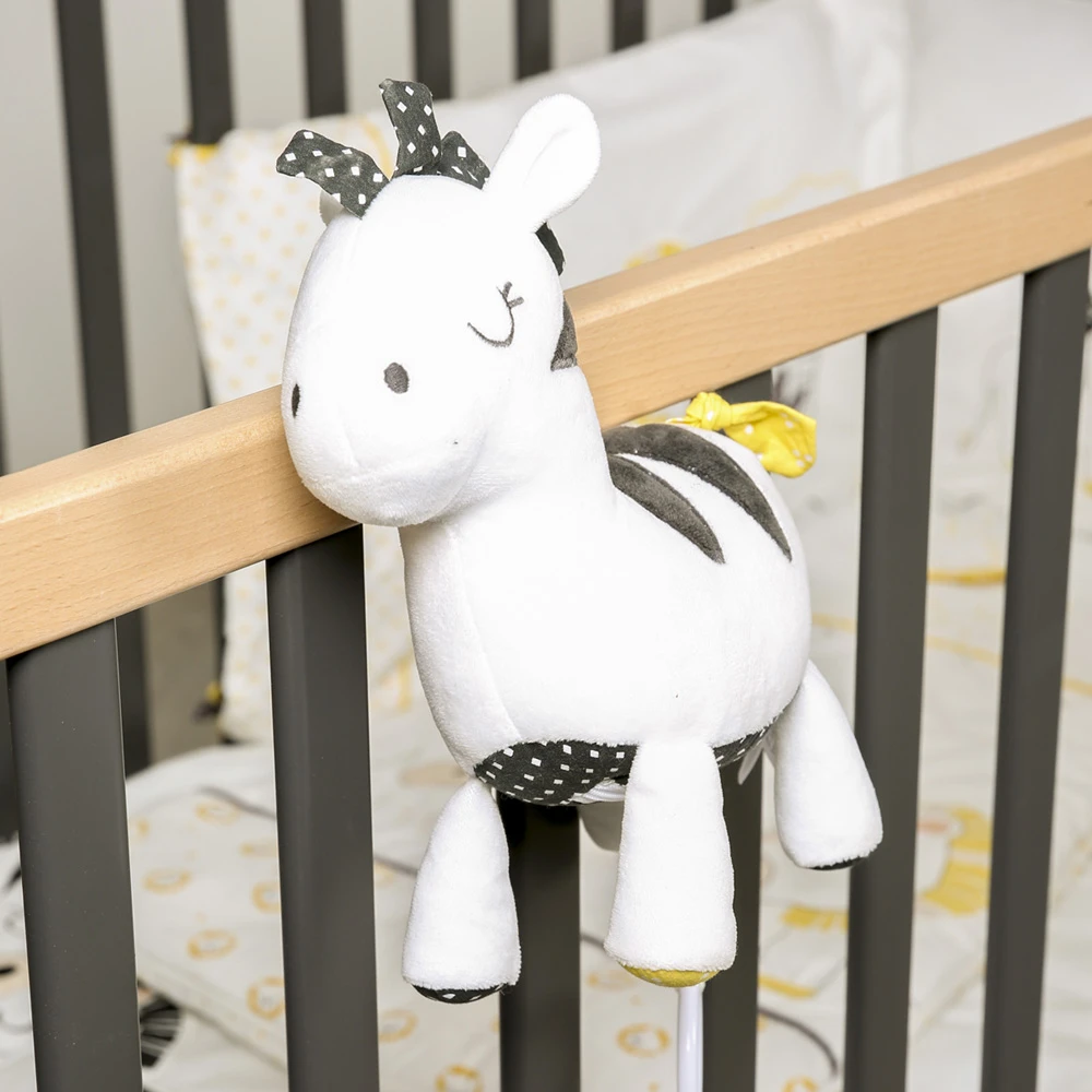 La Peluche bébé mini musical pluche et pompon à suspendre s’accrochera aussi bien aux barreaux du lit qu’au montant de la poussette. Sa douce musique accompagnera bébé aux pays des rêves.