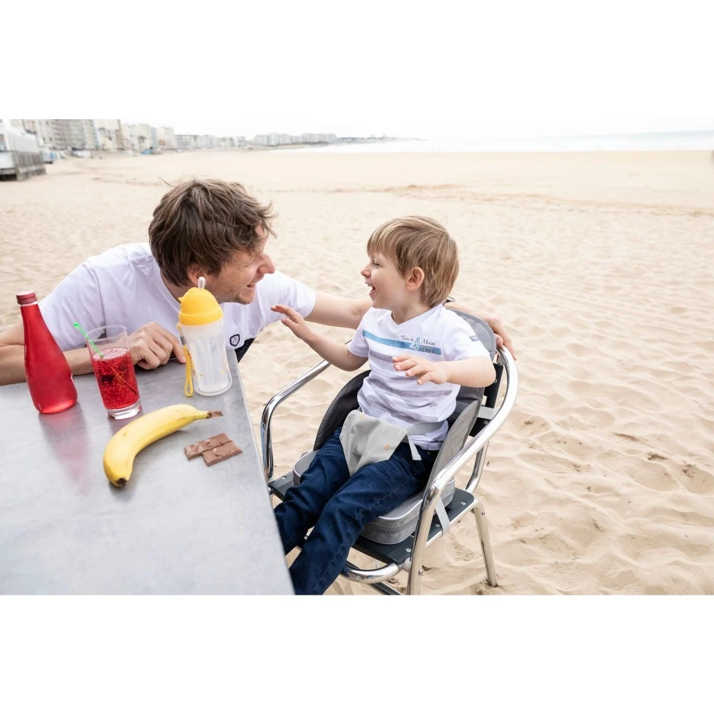 Le Réhausseur de chaise travel booster – warm grey de chez Bebeconfort. Ce réhausseur de chaise permet d’assoir votre bébé à hauteur de la table sur n’importe quelle chaise. Pliable, ce réhausseur pourra être glissé dans un sac afin de l’emmener partout.