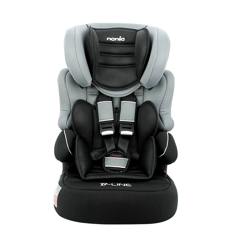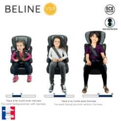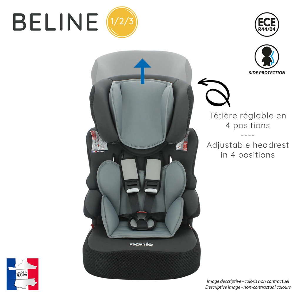 Le siège auto BELINE du groupe 1/2/3 de la marque Nania. Il est utilisable de 9 à 36 kg soit de 2 ans à 10 ans environ. Ce siège auto Nania est fabriqué et testé en France, de plus il est homologué selon la norme ECE R44/04. Il s’installe face à la route (à l’arrière de la voiture) à l’aide de la ceinture de sécurité à 3 points du véhicule.